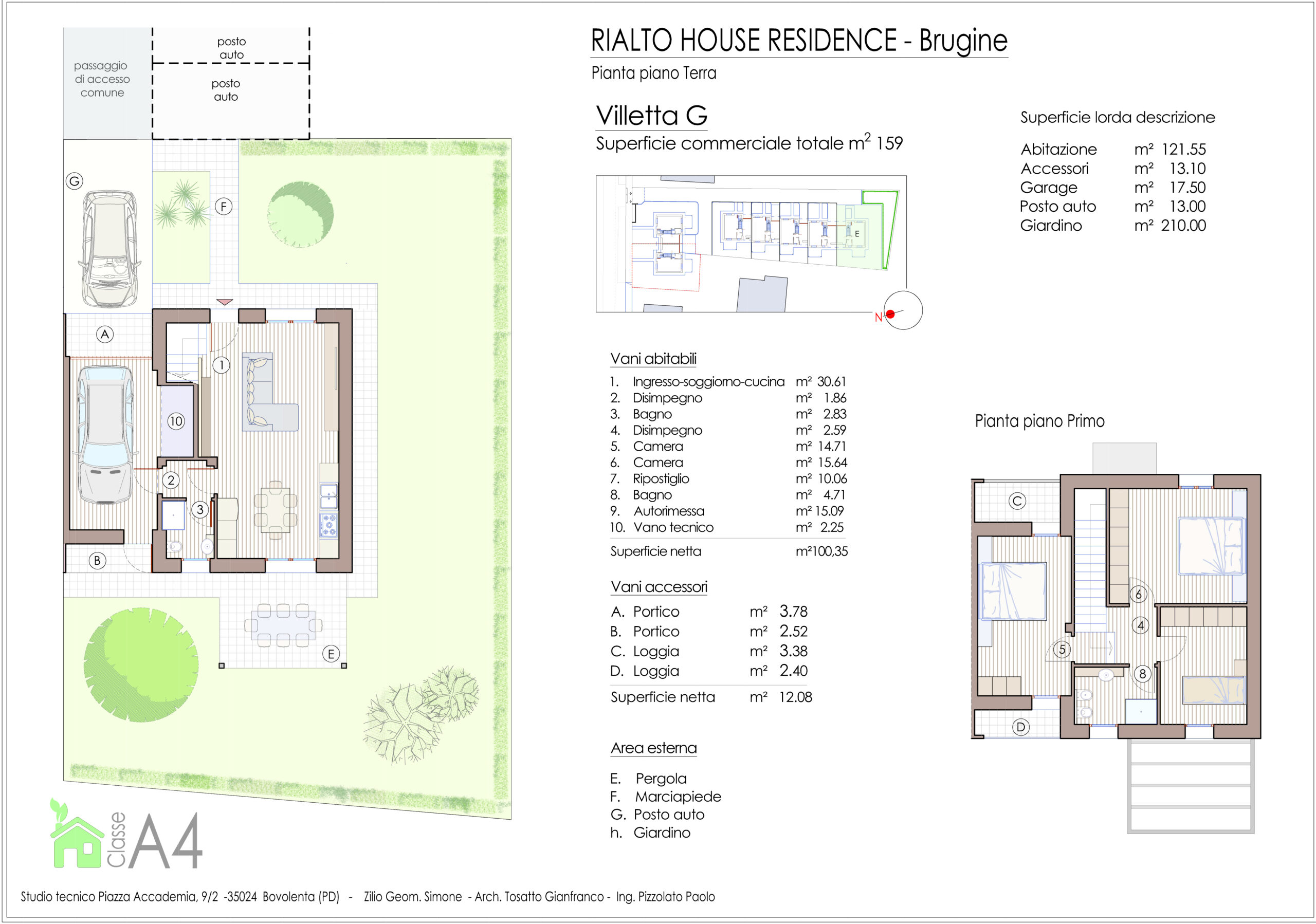 Ogni porzione di villetta è dotata di ampia zona giorno, due bagni, tre stanze da letto e due logge, oltre al garage, posto auto e giardino privato.